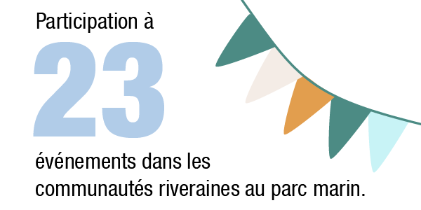 10 565 personnes ont été rencontrées lors d’activités permettant de faire connaître les écosystèmes du parc marin et les façons de les protéger, comme des festivals, événements publics, activités virtuelles et conférences.